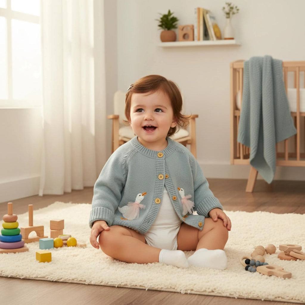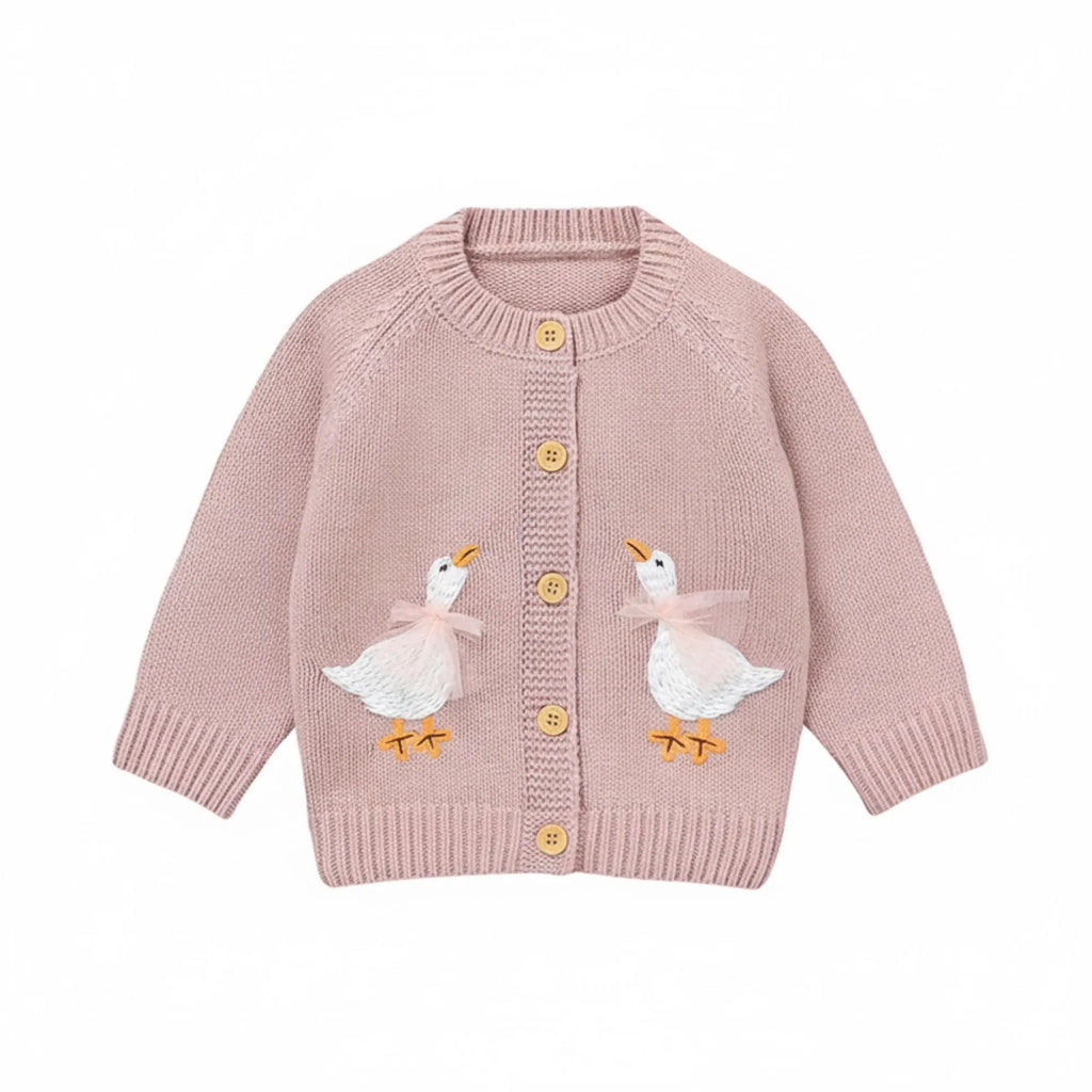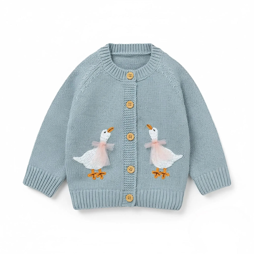 Wrap your little one in charm with this Baby Goose Embroidered Knit Cardigan — a cozy, beautifully detailed sweater perfect for any season. Available in blush pink or powder blue, this cardigan features two sweet embroidered geese adorned with soft tulle bows, bringing a whimsical cottage-core touch to your baby’s wardrobe.