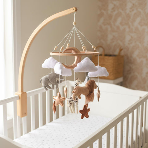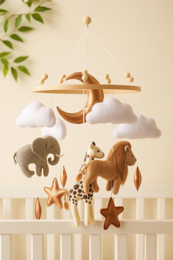 What’s included 1 mobile with felt lion, elephant, giraffe, clouds, stars, and crescent moon on a wooden hoop Pre-strung and balanced—ready to hang