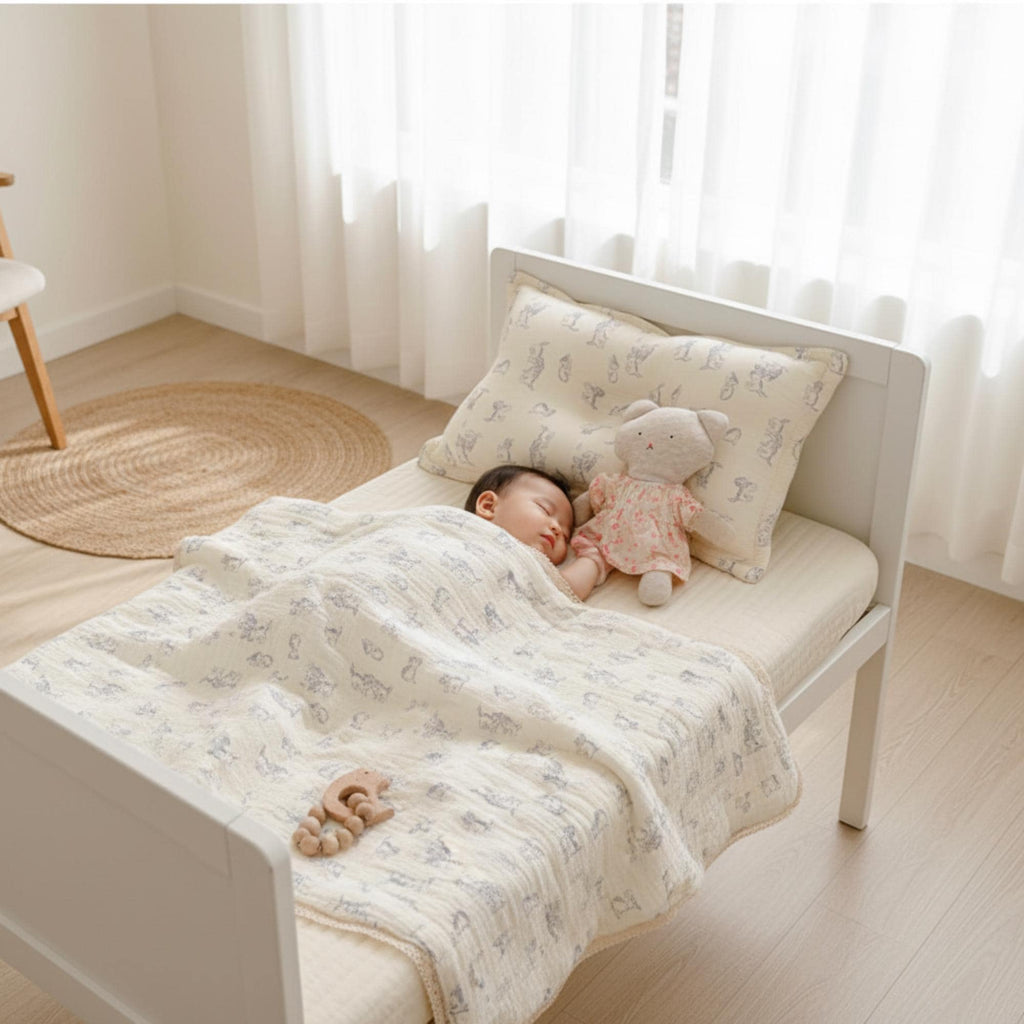 Sizes & Weights (Select from the drop-down) 120 × 150 cm – 0.7 kg (lightweight spring/summer) 120 × 150 cm – 1.0 kg (medium all-season) 150 × 200 cm – 1.2 kg (lightweight toddler bed/sofa throw) 150 × 200 cm – 1.6 kg (cozier fall/winter) Tip: 120×150 cm fits most cribs/mini beds; 150×200 cm is great for toddler beds and years of use. Very Versatile Blanket: This crib baby blanket let your baby feel comfortable, just like a warm embrace when it is wrapped around them. Perfect for snuggling up on the crib, baby bed as a cover, stroller blanket, and baby travelling envelope for many occasion. Washing and Caring Tips: Knit blanket could be hand and machine washed in cold water separately. Do not bleach; tumble dry low, iron on lowest setting as needed. Wash it before use to keep this blanket more soft. Inclusion : 1 x Bedding and 1 x Pillow Materials & Care Shell: soft, breathable cotton blend Fill: hypoallergenic down-alternative microfiber Care: machine wash cold on gentle; tumble dry low or line dry; do not bleach; cool iron if needed Safety Note Use quilts and pillows for supervised snuggles and décor. Follow safe-sleep guidelines for unattended sleep. Perfect For Vintage nursery décor, neutral or classic themes Baby shower gifts and registry must-haves Tummy time mats, stroller blankets, toddler nap quilts