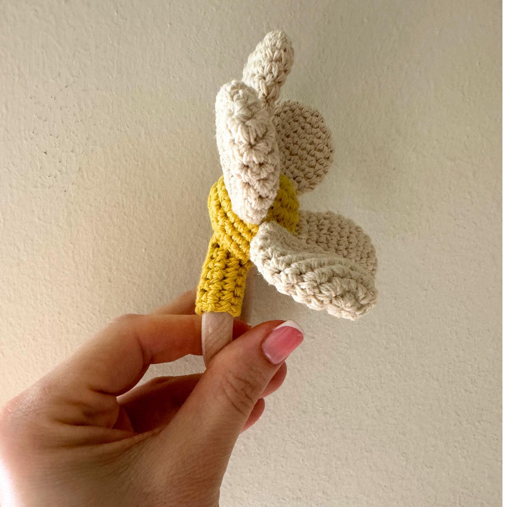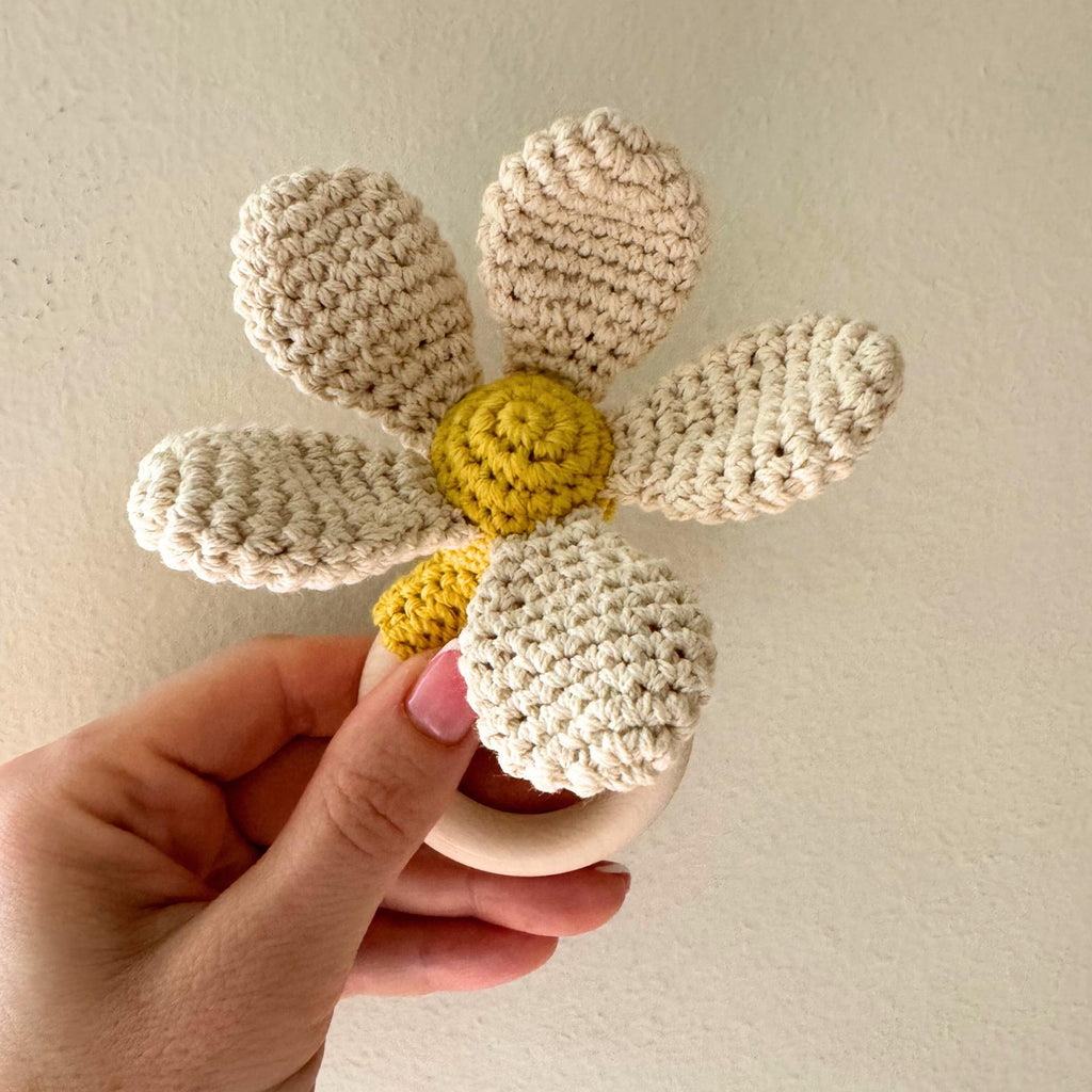 Handmade with cotton yarn in warm naturals, it’s a beautiful keepsake for newborn photos, stroller walks, and baby shower gifting. What’s included 1 Lemon rattle (hand-crocheted, lightly stuffed) 1 Daisy rattle (petals for tactile play) Both attach to an easy-grip natural beech-wood ring Materials 100% cotton yarn (baby-safe, low lint) Hypoallergenic poly-fiber fill Enclosed BPA-free rattle insert (soft jingle) Natural beech-wood teether ring, sanded smooth (food-grade oil finish on request) Approx. size Lemon: 4.5–5 in (11–13 cm) long Daisy: 4.75–5.5 in (12–14 cm) across Ring: 2.5 in (6–6.5 cm) diameter (Handmade—sizes may vary slightly.)