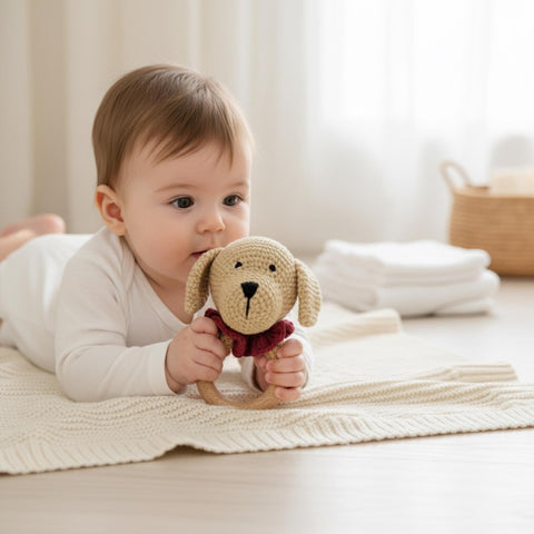 A sweet little puppy rattle for tiny hands! This handmade amigurumi pup is stitched in soft cotton and attached to a smooth beech-wood teething ring.