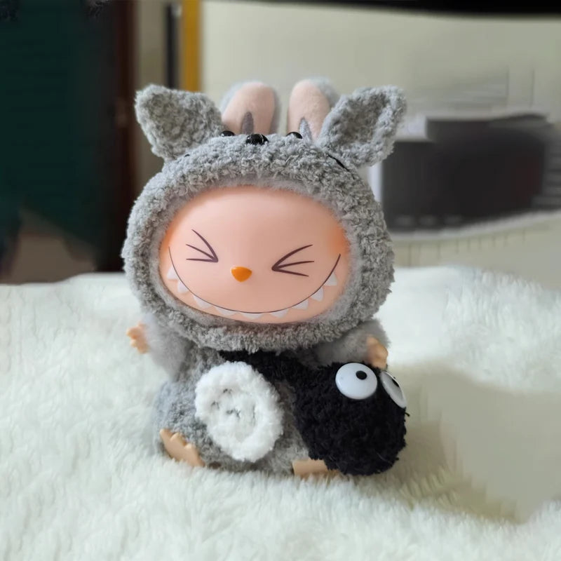 Dress your Labubu in the coziest, cutest costume — a soft, grey Totoro-inspired outfit made to turn any shelf or photo into pure kawaii magic. This plush hooded suit features floppy ears, a fluffy tummy patch, stitched whisker details and a tiny crossbody pouch — all scaled to compliment Labubu-style vinyl figures and other similarly sized collectible dolls.